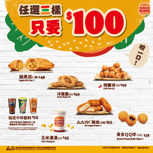 漢堡王點心優惠套餐|任選三樣漢堡王點心只要$100!蘋果派、辣薯球、雞塊、洋蔥圈等多種漢堡王人氣點心任選。滿足你的選擇障礙!