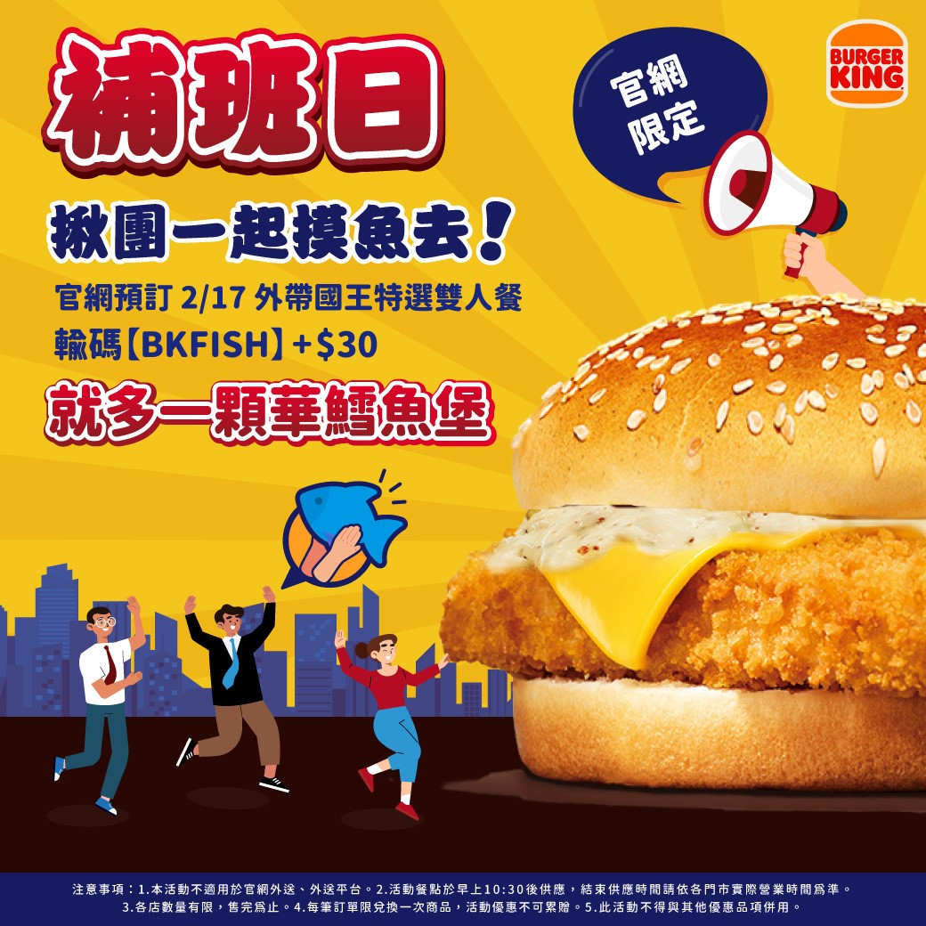 3.本活動餐點僅限訂購【國王特選雙人餐 $269】使用,欲使用兌換碼,須選購指定品項後輸碼【BKFISH】即可+$30加購華鱈魚堡乙顆。
