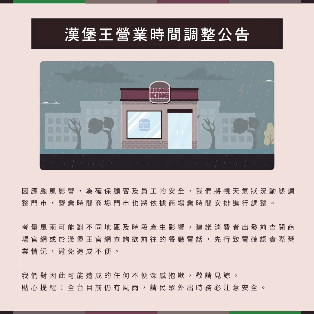 因應丹娜絲颱風影響,為確保顧客及員工的安全,我們將視天氣狀況動態調整門市,營業時間商場門市也將依據商場營業時間安排進行調整。 考量風雨可能對不同地區及時段產生影響,建議消費者出發前查閱商場官網或於漢堡王官網查詢欲前往的餐廳電話,先行致電確認實際營業情況,避免造成不便。 我們對因此可能造成的任何不便深感抱歉,敬請見諒。貼心提醒:全台目前仍有風雨,請民眾外出時務必注意安全。
