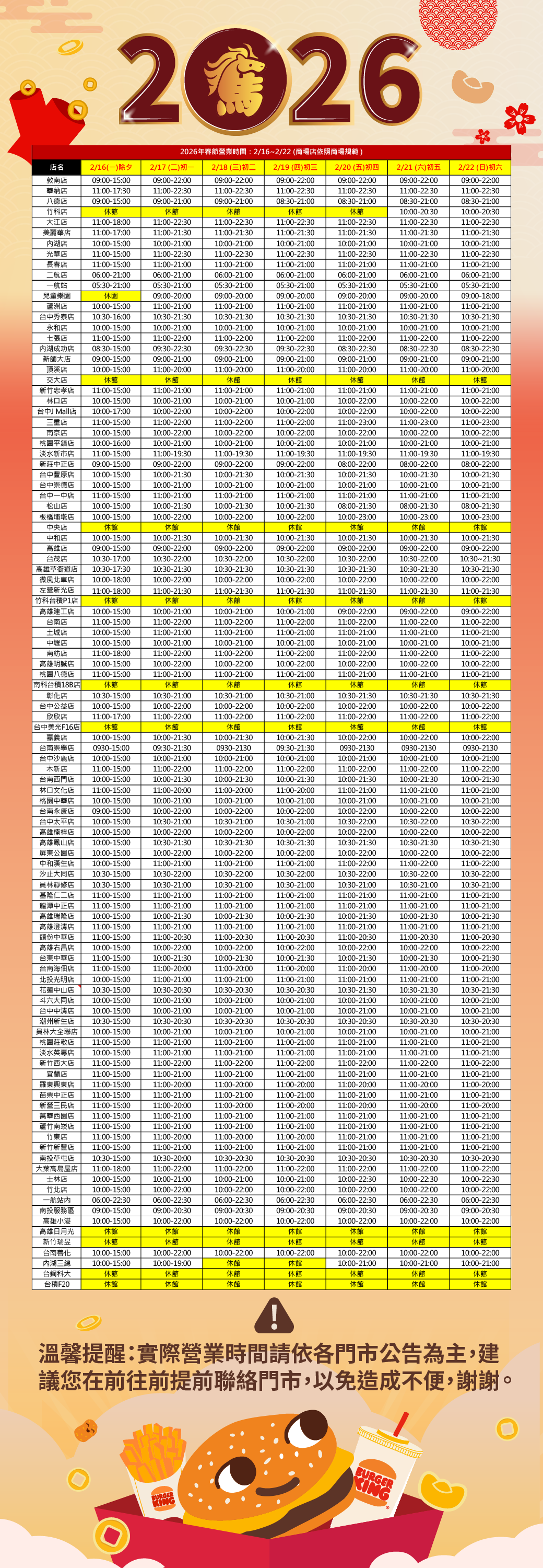 2026漢堡王門市新春營業時間公告<實際營業時間請依各門市公告為主>