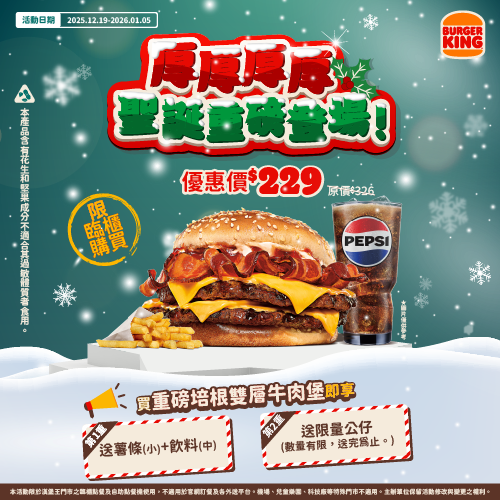 為迎接溫暖聖誕季,漢堡王推出期間限定《聖誕節活動》,於 門市臨櫃限定販售。活動期間凡購買指定商品 「重磅培根雙層牛肉堡」$229(單點),即可享有以下優惠: