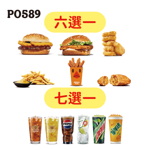 六選一(洋蔥圈烤牛堡/經典脆雞堡/6塊雞塊/蘋果派/雞薯條8入/勁濃起士薯)+小飲